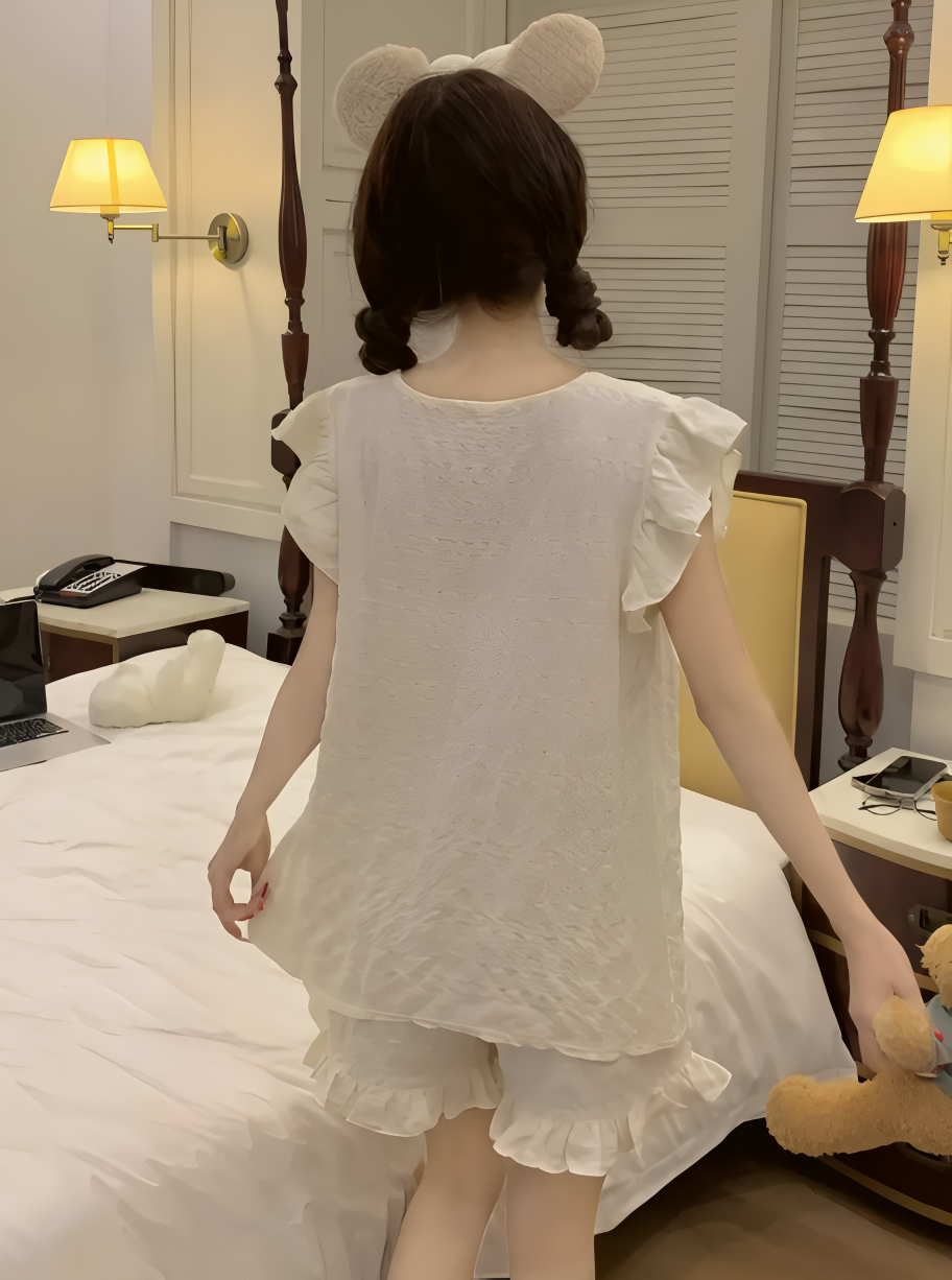 Embrace ultimate comfort and elegance with this lovely short-sleeve pajama set. Featuring delicate ruffle details and a flowy silhouette, this cream-toned lounge set is designed for warm nights and relaxed mornings. The top comes with soft pleats and a ribbon bow accent, while the matching shorts feature frilled hems for a charming touch.