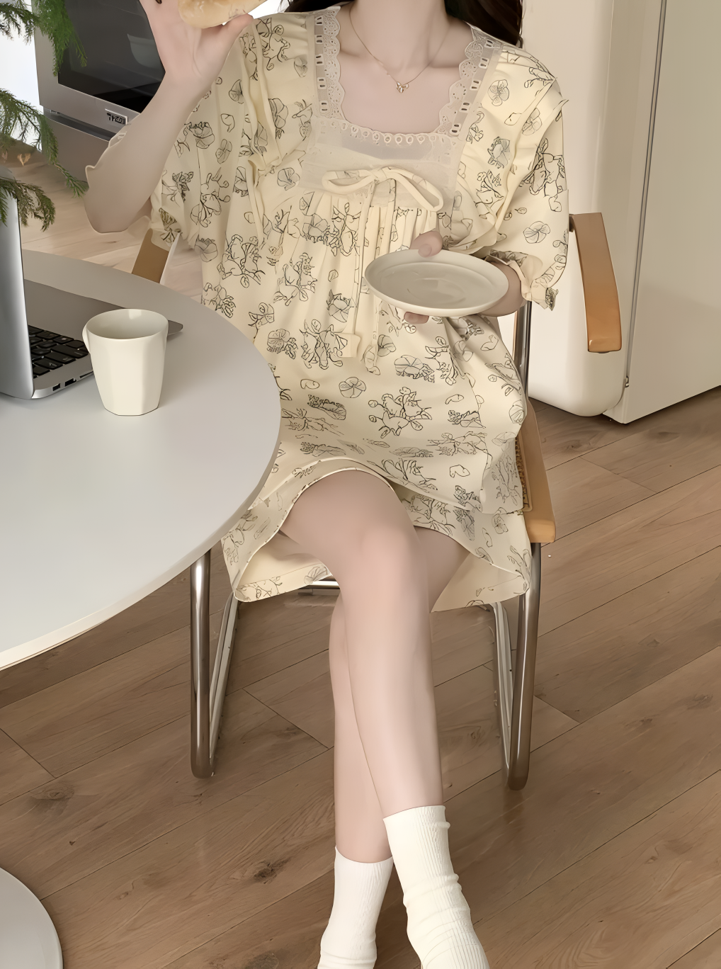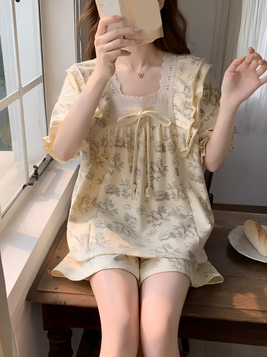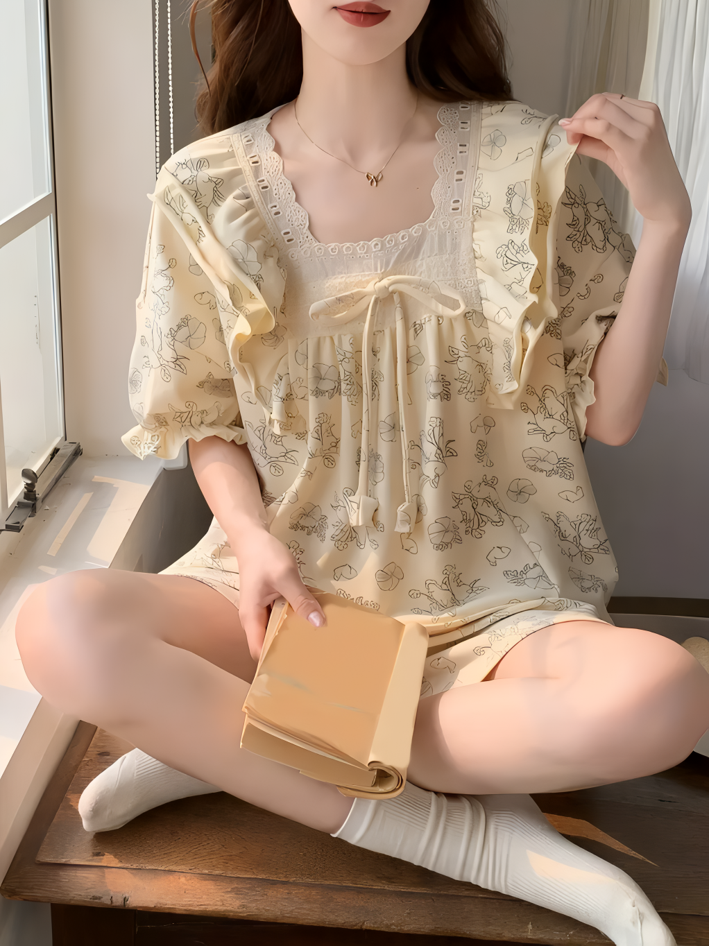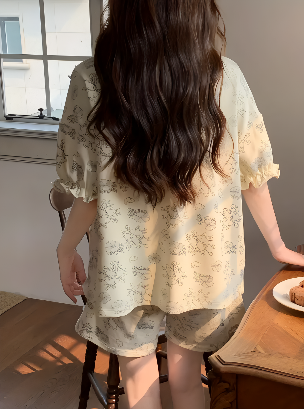 Stay cozy and stylish with this charming floral pajama set designed for comfort and convenience. Perfect for spring and summer nights, this set features a lightweight short-sleeve top with a built-in bra pad for gentle support—no need for extra layers. The matching elastic-waist shorts provide a relaxed fit that moves with you, making it ideal for lounging, sleeping, or casual days at home.