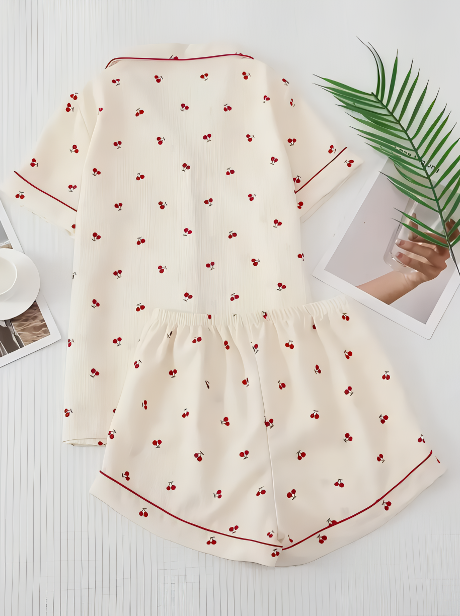 Stay cozy and cute all night long with this adorable cherry print pajama set. Featuring a soft, breathable fabric and charming red cherry design, this two-piece set includes a short-sleeve button-up shirt and matching shorts with contrast piping. Ideal for warm nights and lazy mornings, it’s a must-have addition to your loungewear collection.