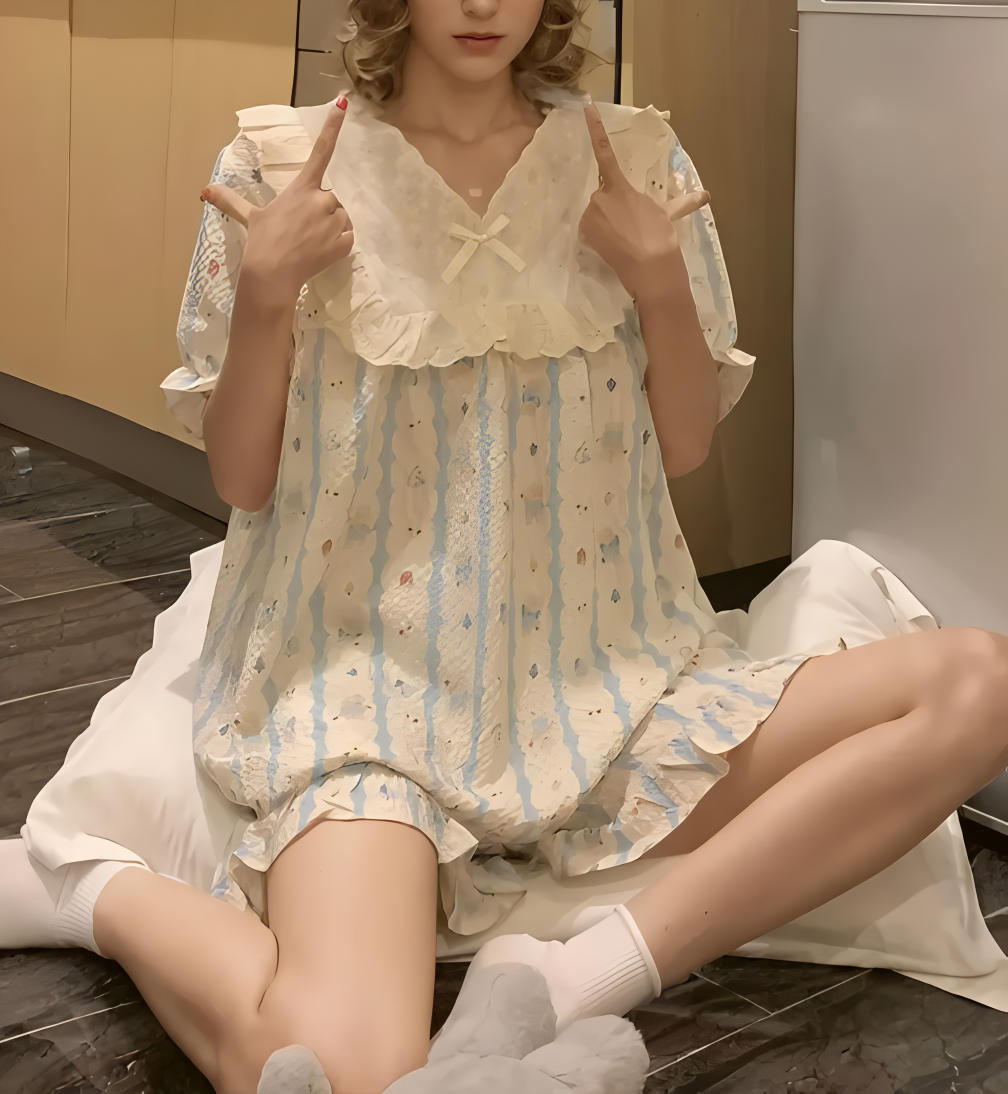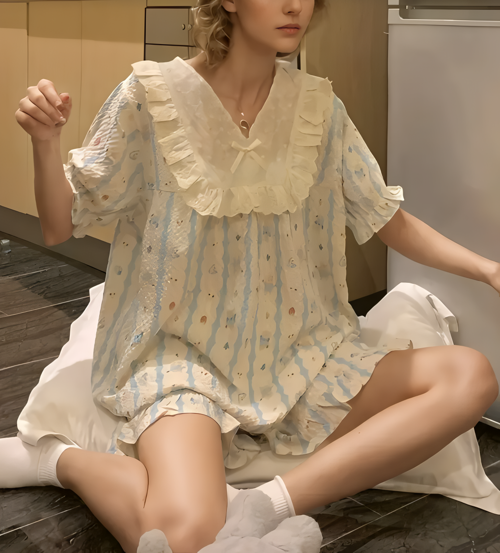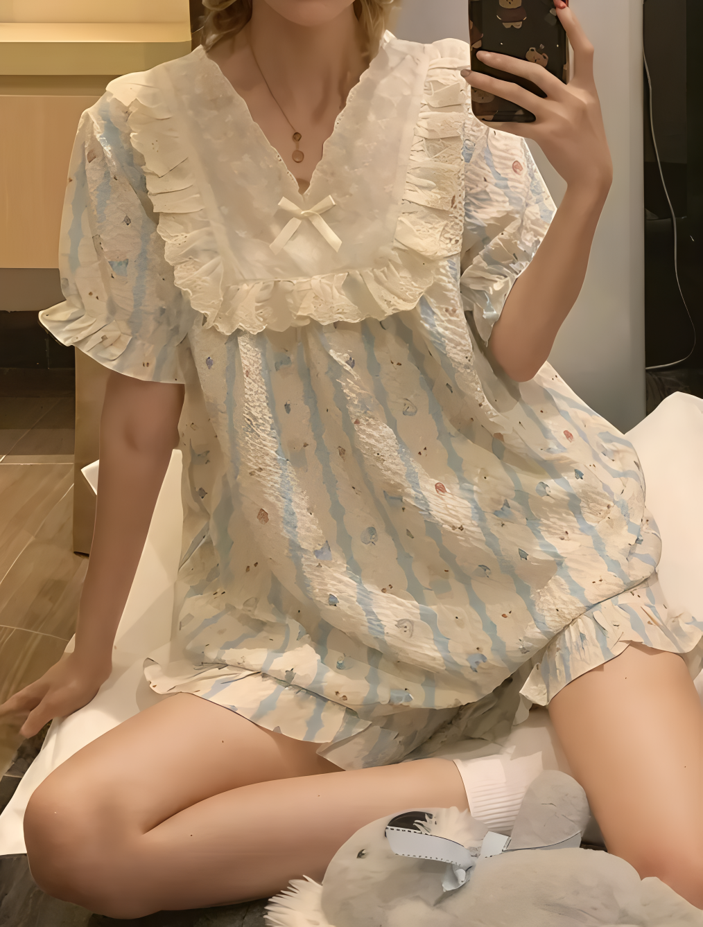 Stay cute and comfy all night long in this light and lovely pajama set! Designed with soft teddy bear prints and an oversized lace ruffle collar, this sleepwear set adds a touch of vintage charm while keeping you cool through warm summer nights. The short sleeves and above-knee length offer breathable ease, perfect for lounging or bedtime.