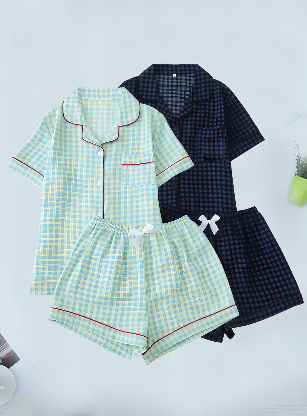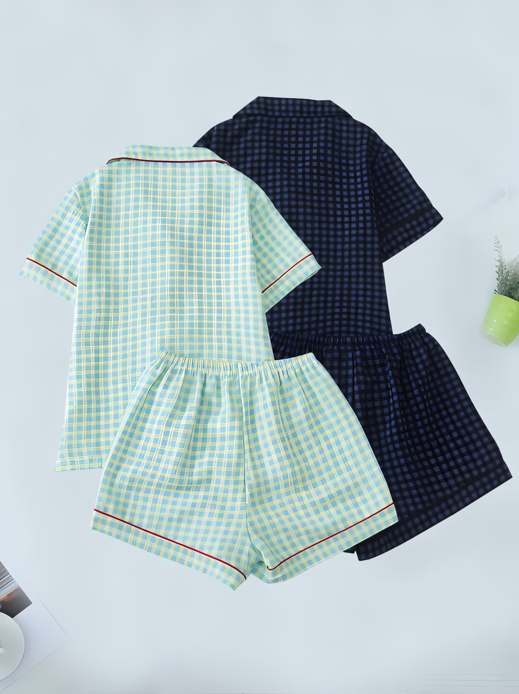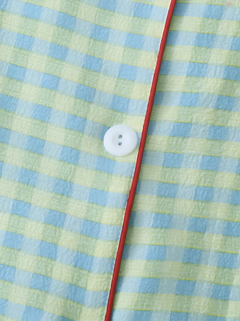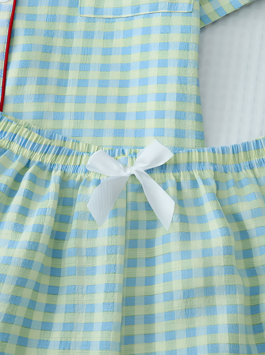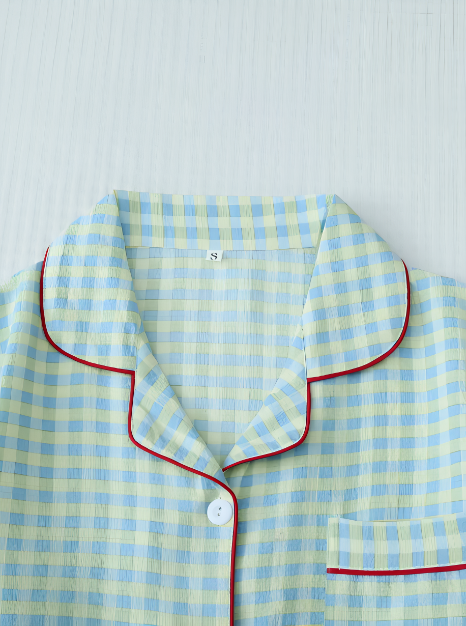 This lightweight pajama set features a charming checkered pattern in pastel blue and yellow with contrasting red piping details for a stylish finish. The set includes a button-up short-sleeve top with a classic notched collar and a front pocket, paired with matching shorts. Designed for both comfort and breathability, it’s ideal for warm nights or lounging at home.