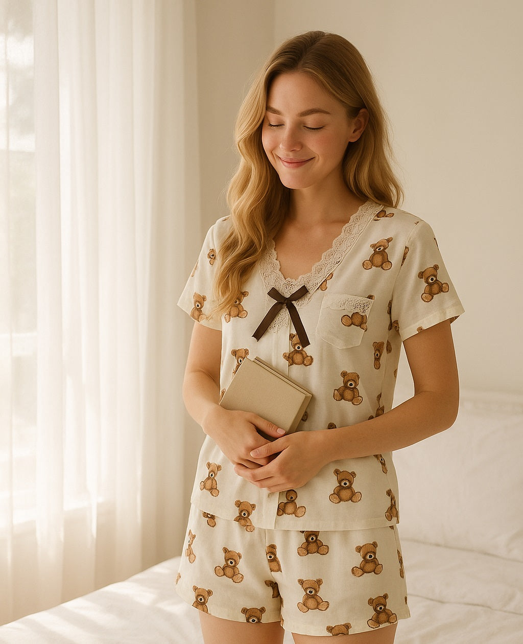 Stay cute and comfy with this Two-Piece Teddy Print Sleepwear Set. Featuring a relaxed-fit top and matching shorts, this set is designed for ultimate comfort while keeping your bedtime style effortlessly adorable.