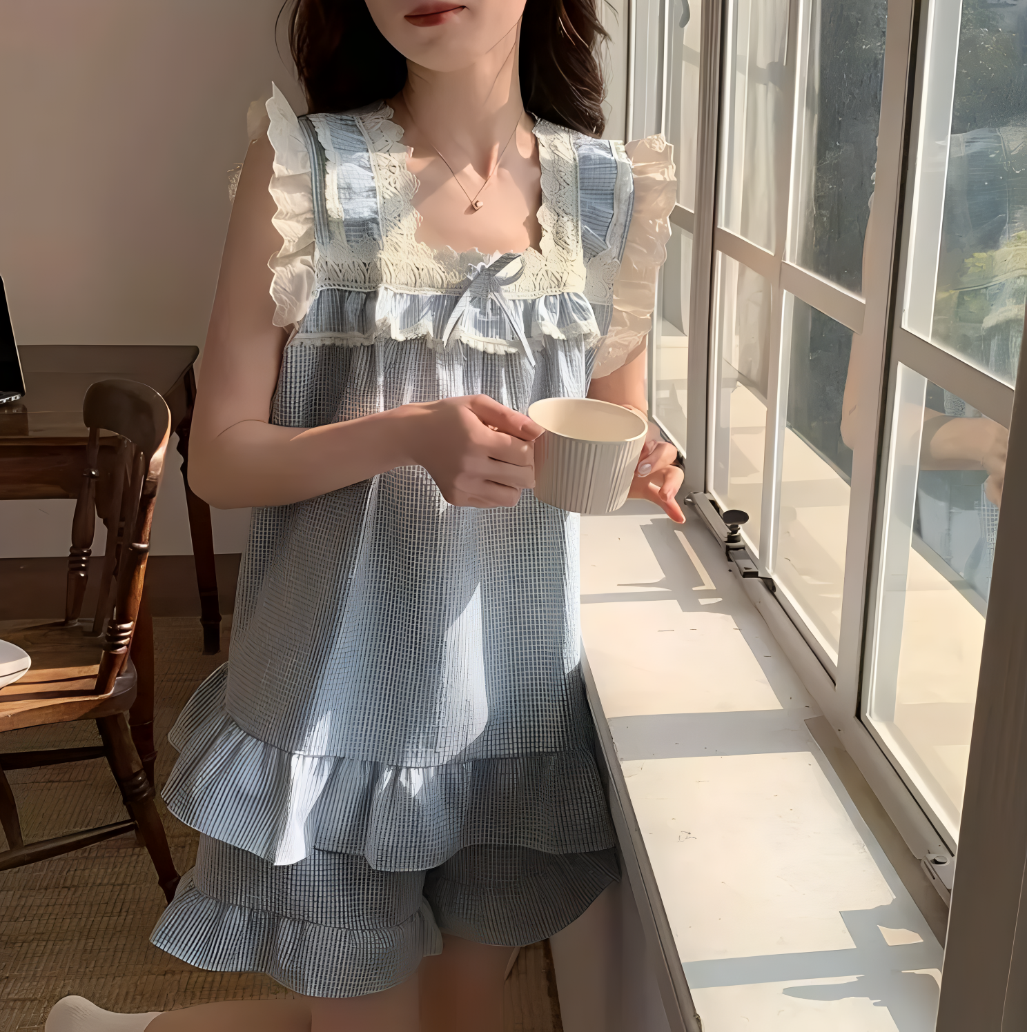 Relax in style with this adorable two-piece pajama set—comprising a short-sleeve top and cozy shorts, featuring a built-in bra pad for light support. Crafted from soft, breathable fabric, this set is designed for effortless comfort, whether you’re winding down at home, traveling, or enjoying lazy weekend mornings.