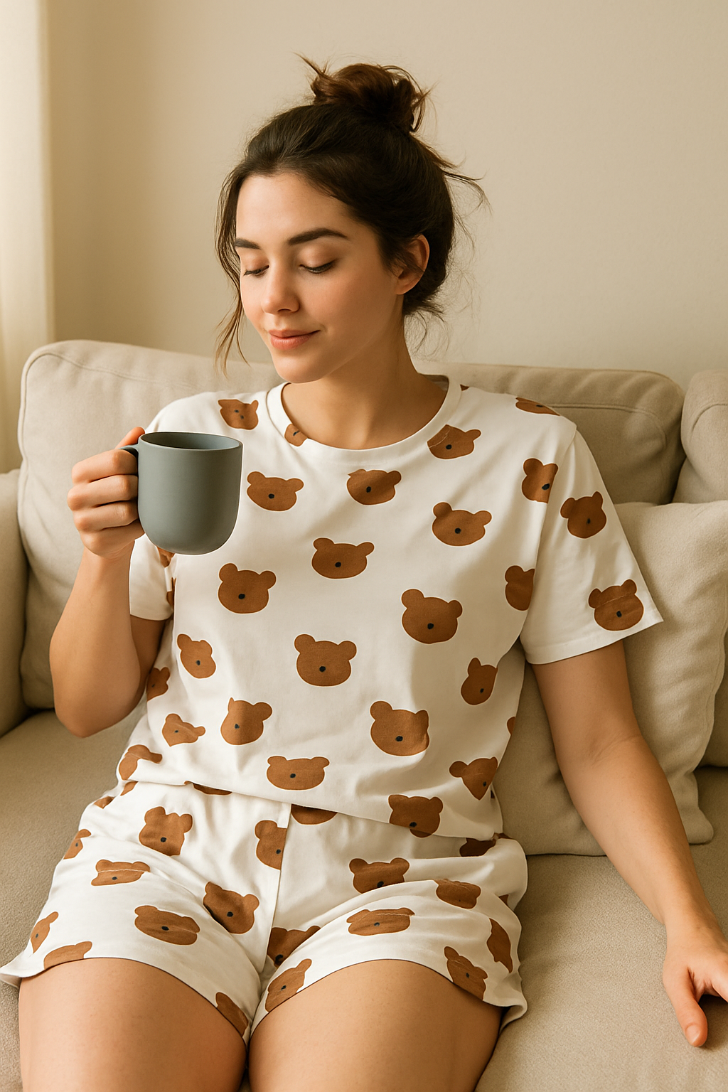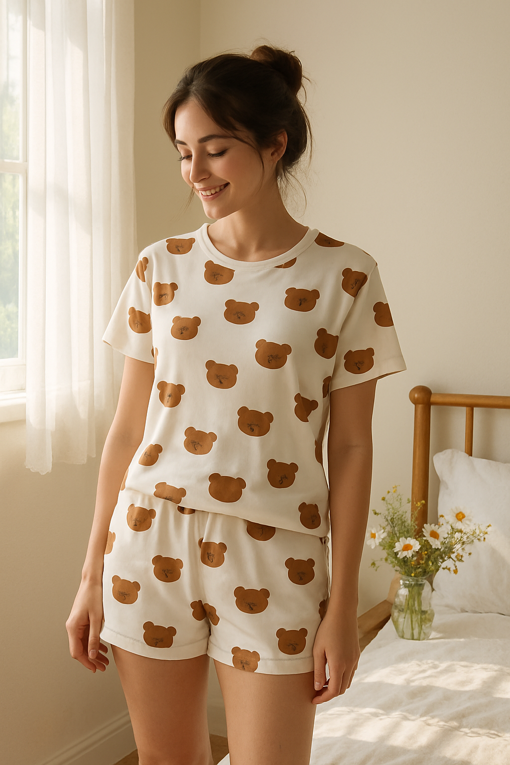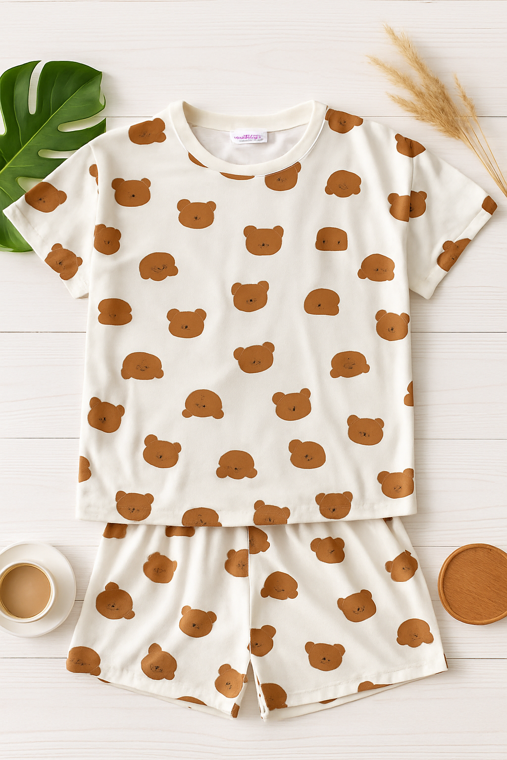 Sleep in sweetness with this White Teddy Print Sleepwear Set. Featuring a soft short-sleeve T-shirt and matching shorts, this set is designed for all-night comfort and a touch of cuteness. The crisp white base paired with playful brown teddy bear prints gives it a cheerful yet cozy vibe, making it a bedtime favorite.